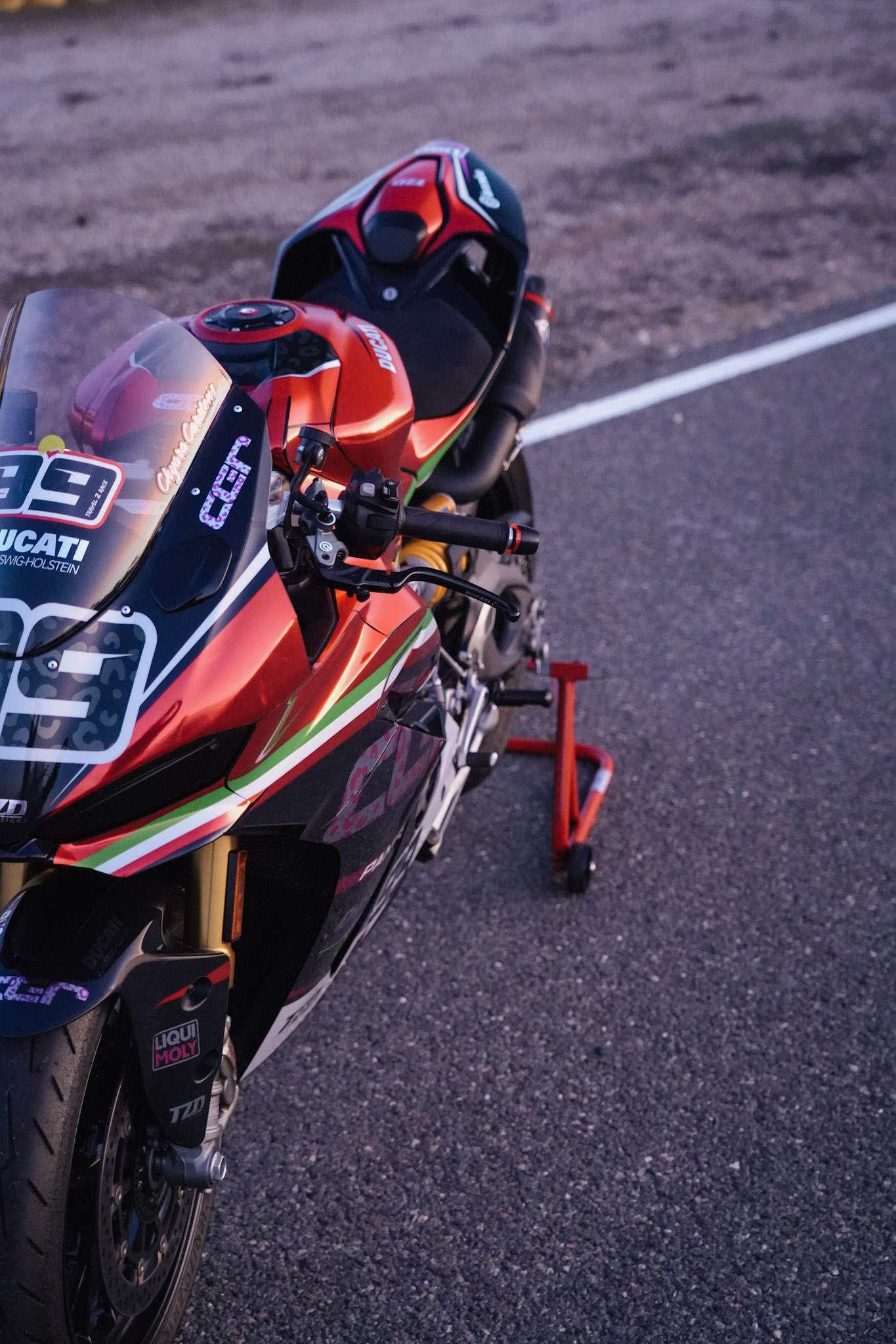Die sportliche, auffällige Chrom-Folierung mit den italienischen Farben verbindet Rennsport-Ästhetik mit exklusivem Design und macht dieses Bike zu einem unverwechselbaren Einzelstück – auf der Strecke wie im Fahrerlager- dank Tabea, TZ Designs.